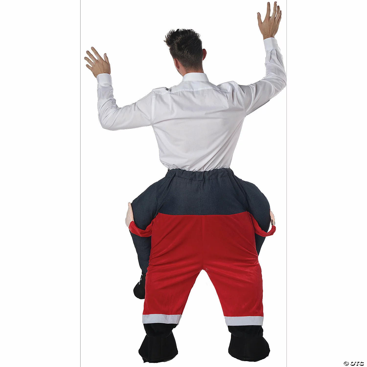 Carry Me Santa Adult CostumeSimple pants with elastic and drawstring waist give the great illusion of the wearer riding on Santa’s back! Great for the Holidays! Just stuff the legs with plastic bags or polyfill through the zipper installed in the false legs. Also stuff the arms of the character for a very realistic look! 100% polyester. Hand wash cold, line dry. Do not use bleach, do not iron. Available Sizes: One size fits most adults White shirt and Santa hat are not included.Special Shipping Information: This item ships separately from other items in your order. This item cannot ship to a P.O. Box. This item may be subject to additional processing days.ITEM IS NOT ELIGIBLE FOR EXPEDITED SHIPPING