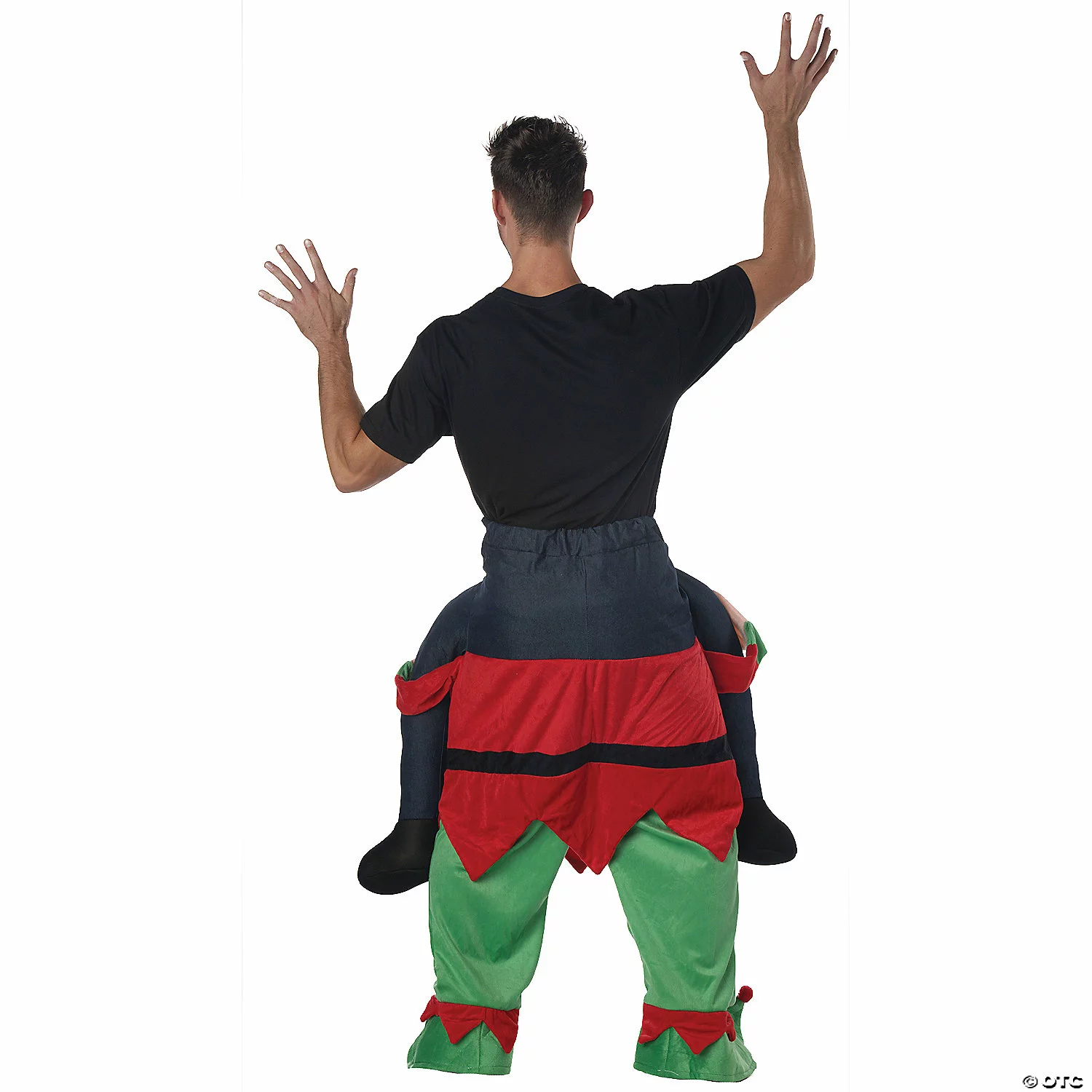 Adult Carry Me Elf CostumeSimple pants with elastic and drawstring waist give the great illusion of the wearer riding on an Elf’s back! Just stuff the legs with plastic bags or polyfill through the zipper installed in the false legs. Also stuff the arms of the character for a very realistic look! 100% polyester. Hand wash cold, line dry. Do not use bleach, do not iron. Availabel Sizes: One size fits most adults Santa hat and black t-shirt is not included.Special Shipping Information: This item ships separately from other items in your order. This item cannot ship to a P.O. Box. This item may be subject to additional processing days.ITEM IS NOT ELIGIBLE FOR EXPEDITED SHIPPING