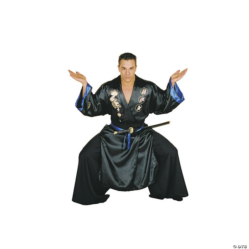 This Samurai costume is a unique Halloween costume that will make you feel like a real Samurai! This Japanese warrior outfit is sure to win at the costume contest. Sizes 42-44. Polyester.Includes:• Full length silk robe• Fully embroidered front and back• Wide leg pantsMade in the USA.