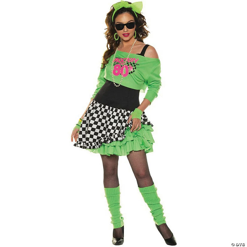 Rock out in this totally bodacious 80’s costume. This retro looking dress is perfect for capturing the 1980’s fashion trend. The Adult Totally Awesome costume includes an off-the-shoulder neon green long sleeve shirt with “Rockin the 80’s” screen print on front. The shirt is attached to a black mini dress with layered skirt. The layered skirt features a black and white checkered pattern with frilly green ruffles underneath. Headband, jewelry, gloves, fishnet stockings, leg warmers and shoes not included.